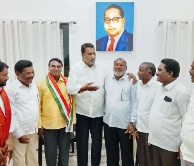 ధర్మారం (తెలంగాణ వాణి విలేకరి) పెద్దపల్లి జిల్లా ధర్మారం మండలంలోని కొత్తూరు గ్రామానికి చెందిన బిఆర్ఎస్ నాయకుడు నెరువట్ల రాజయ్య తెలంగాణ రాష్ట్ర సంక్షేమ శాఖ మంత్రి అడ్లూరి లక్ష్మణ్ కుమార్ ను హైదరాబాద్ మినిస్టర్ క్వార్టర్స్ లో కలిసి ఆయన సమక్షంలో కాంగ్రెస్ పార్టీలో చేరారు. మంత్రి ఆయనకు కాంగ్రెస్ కండువా కప్పి పార్టీలోకి సాధారణంగా ఆహ్వానించారు. ఈ కార్యక్రమంలో కాంగ్రెస్ పార్టీ సేవాదళ్ ళ్ జిల్లా అధ్యక్షుడు బొల్లి స్వామి, ఏఎంసీ డైరెక్టర్ కాంపల్లి రాజేశం, నాయకులు కాంపల్లి పోచయ్య, నెరువట్ల మల్లయ్య, చొప్పదండి మల్లేశం. ఇటీవల ఎమ్మార్పీఎస్ మండల శాఖ కన్వీనర్,కో కన్వీనర్ గా నియామకమైన ఇరుగురాల మహేష్, చొప్పదండి అభిలాష్ లను మంత్రి శాలువాతో సన్మానించారు.